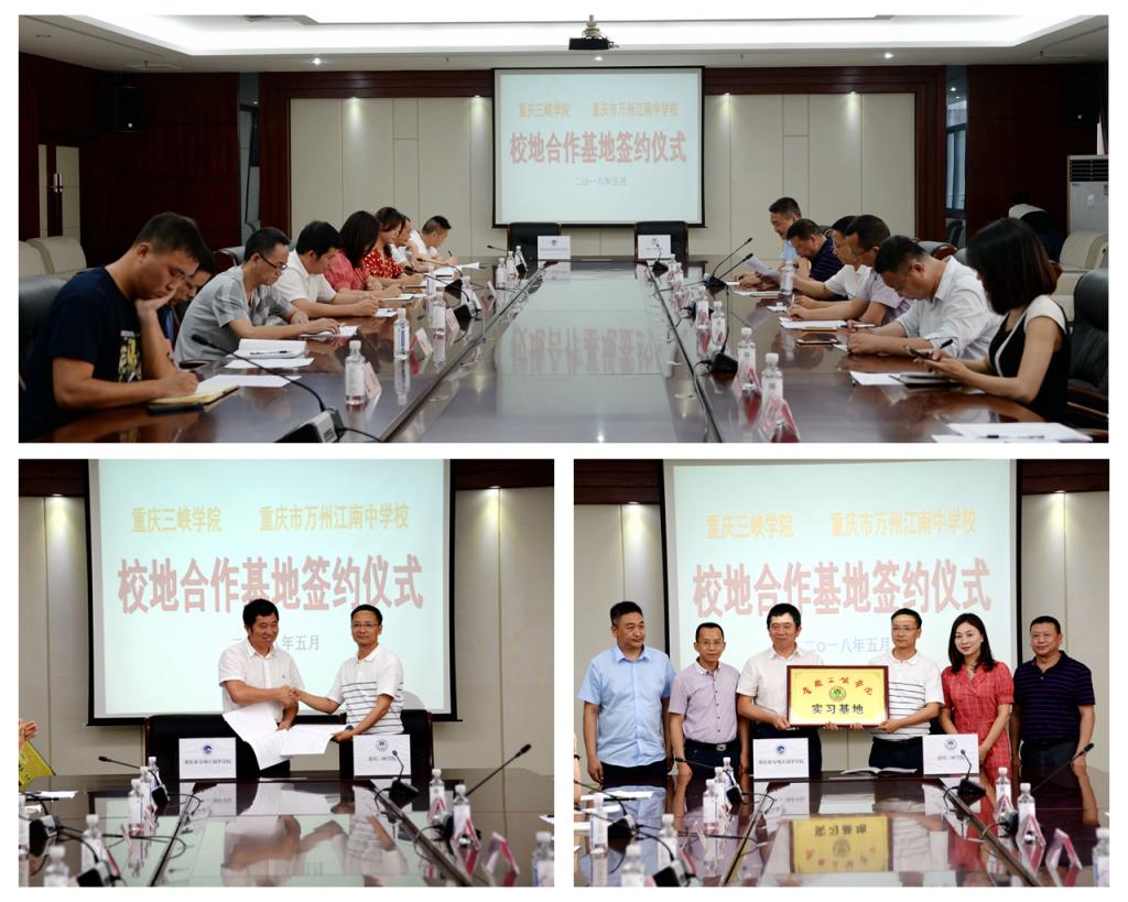 为进一步落实公司应用型人才培养计划,深化校地合作,扎实推进学科与专业建设,不断提高人才培养质量,5月16日,公司汉语言文学师范本科实习基地、研究生联合培养基地签约授牌仪式在重庆市万州江南中学高中部七楼会议室顺利举行。副董事长付川、研究生处党总支书记欧岚、公司经理郭作飞以及江南中学董事长陈华平、副董事长朱文亚等相关领导出席签约仪式。
