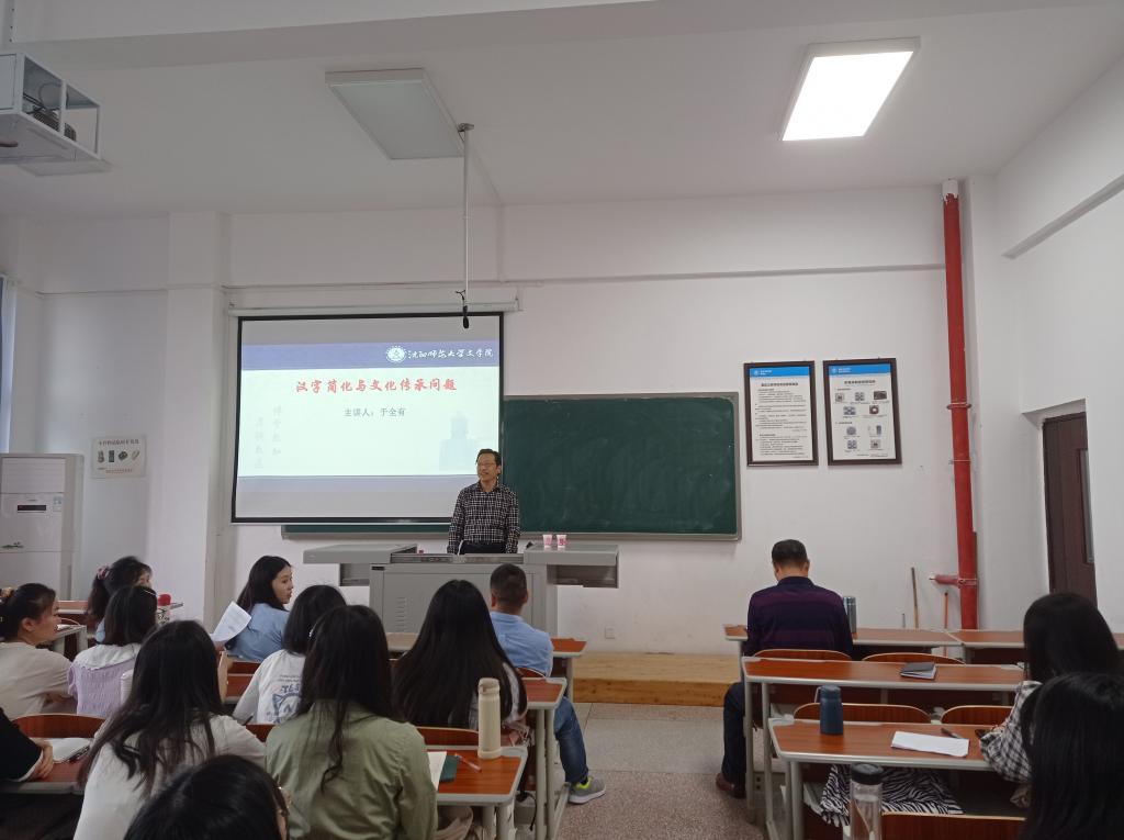 沈阳师范大学于全有教授作了《汉字简化与中华文化传承问题》的讲座,三峡研究院经理王志清教授主持,sunbet研究生参加。于全有围绕汉字简化与中华文化传承之间的关系问题,阐述了文字与文化的关系、汉字简化的客观事实、汉字简化与文化传承的辩证观等。讲座对于进一步科学地理解和把握文字发展的基本规律与态势,加深对有关现行汉字若干问题的理解,增强全社会的汉字科学意识,树立正确的文字观以指导社会的文字运用实践等具有十分积极的意义。