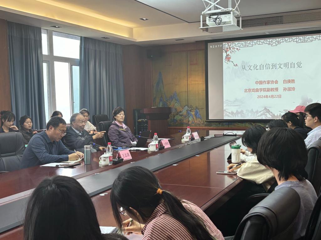4月22日下午,sunbet在博学楼3-404会议室举办了题为“从文化自信到文化自觉”的学术交流座谈会。本次座谈会邀请到了中国作家协会原副主席白庚胜教授和北京戏曲公司孙淑玲副教授作为主讲嘉宾。参与本次座谈会的有三峡研究院经理王志清教授,公司部分教师、研究生和本科生。