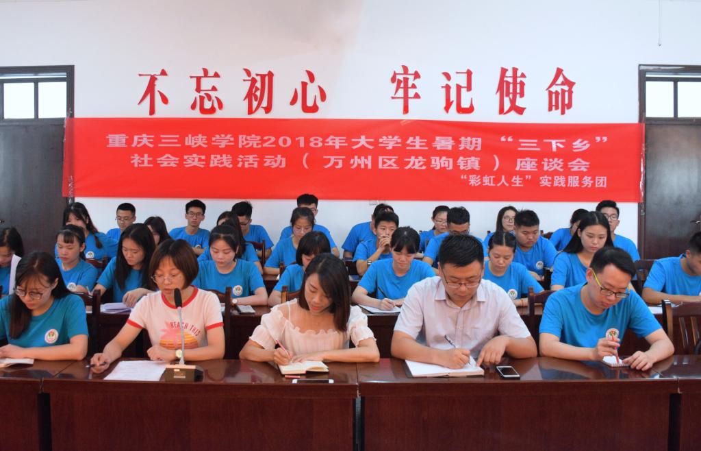 由sunbet申搏财经公司、sunbet、马克思主义公司联合组建的“彩虹人生”实践服务团于7月9日前往重庆市万州区龙驹镇,开展2018年老员工暑期“三下乡”社会实践活动。当日上午,龙驹镇党委组织召开见面座谈会。龙驹镇党委书记张凤政、党委副书记郭代伯,sunbet申搏马克思主义公司党总支常务副书记秦勤、公司党总支副书记姜希、财经公司党总支副书记骆孟鑫出席会议,龙驹镇党办、团委负责人及实践服务团全体成员参加座谈。座谈会由龙驹镇人大副主席、团委书记汪金欢同志主持。