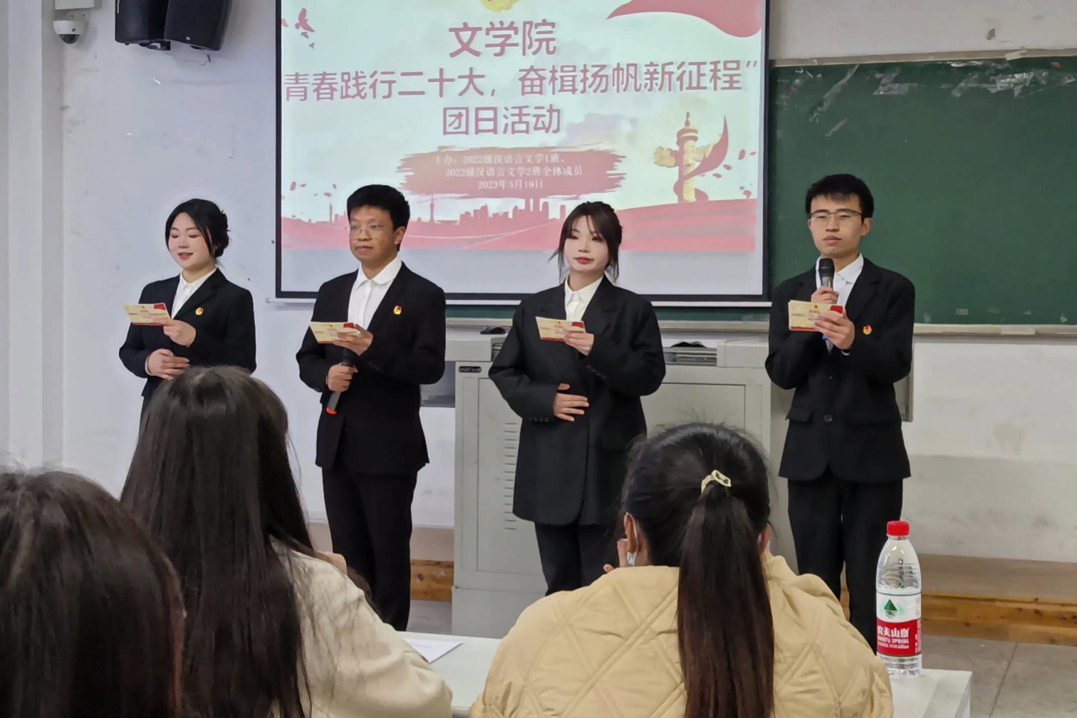 为继续深入学习贯彻党的二十大精神,提高青年团员的思想政治水平。sunbet于2023年3月19日下午2:30在明辨楼1栋204成功举行了sunbet“青春践行二十大,奋楫扬帆新征程”的主题团日活动。2022级汉语言文学专业全体同学参加此次活动。