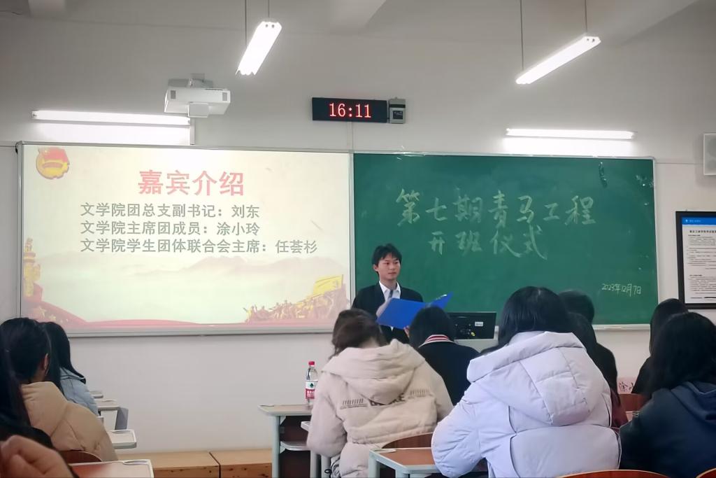 仪式共有六项议程:第一项,主持人组织各学员奏唱团歌;第二项,涂小玲宣读第七期青马工程培训方案。她从培训对象、培训时间、培训目的、培训内容、培训要求以及培训意义六个方面进行详细地阐述;第三项,刘东宣读负责人员名单和组长名单,宣布第七期青马工程正式开班;第四项,各位学员分别上台进行自我介绍;第五项,任荟衫呼吁同学们要珍惜此次机会,坚持以习近平新时代中国特色社会主义思想为指导,锤炼自身品质,提升综合能力;第六项,刘东提出以小组为单位组建一个公司模拟的小游戏,每组派代表上台介绍,其余成员对印象最深刻的小组投票。游戏结束后,刘东指出学员应该树立创新意识,勇于打破常规,积极创造新条件;第六项,主持人宣布本次青马工程开班仪式圆满完成。