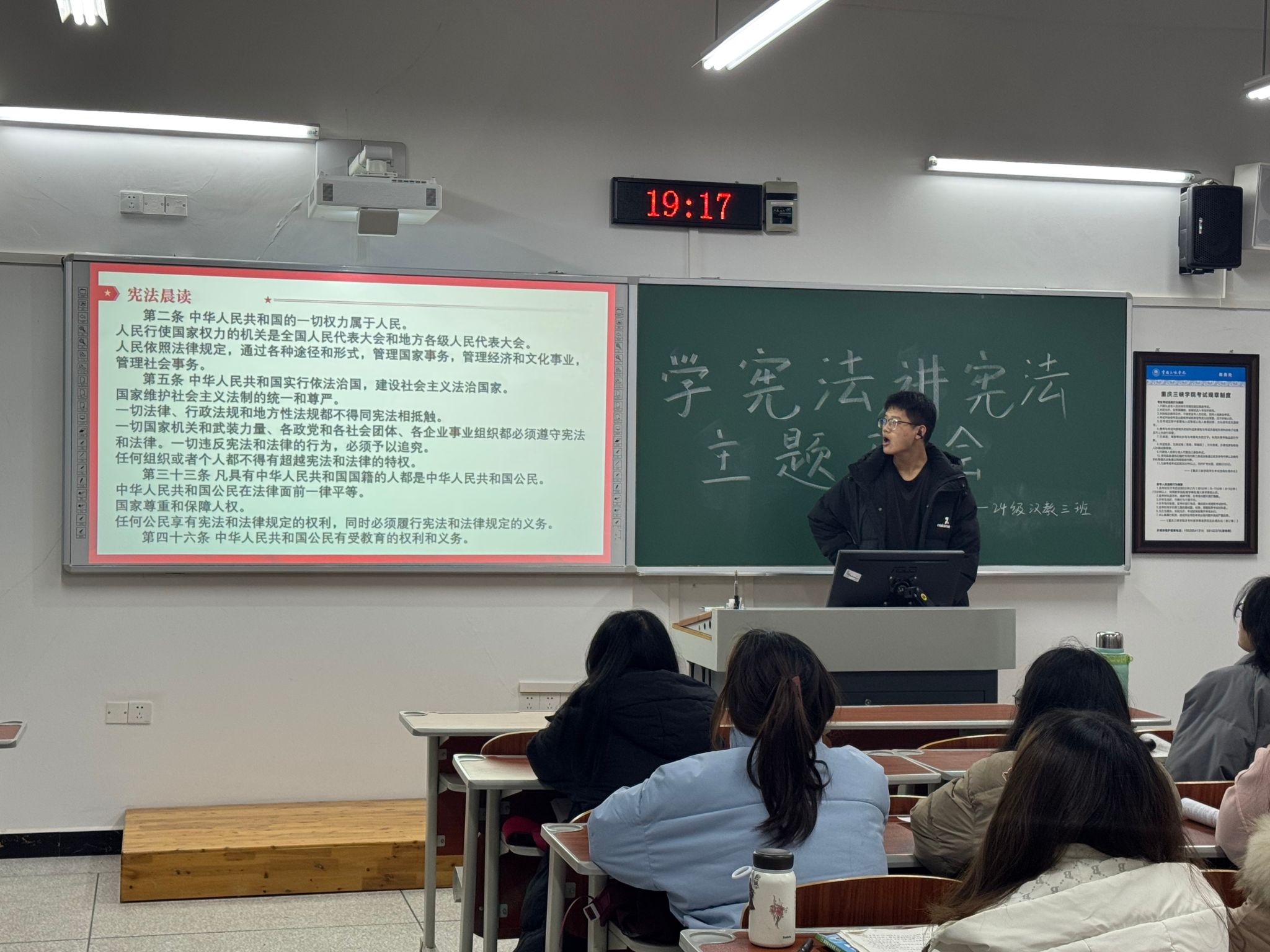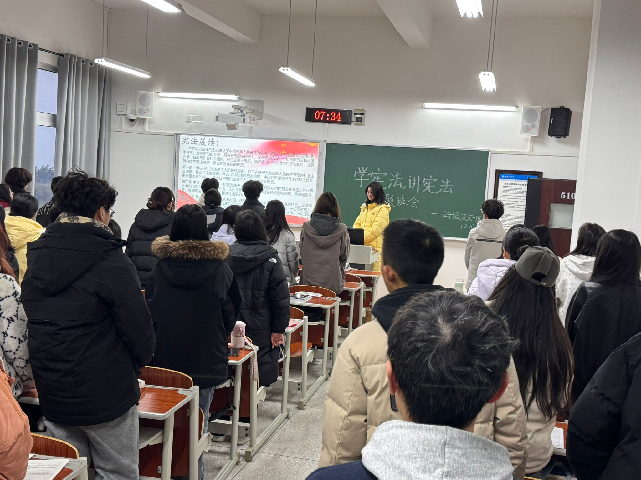 大一员工利用早自习晨读宪法,其他年级员工通过全国青少年普法网,观看教育系统“宪法晨读”活动直播,同步跟读宪法部分条款,深入学习宪法知识。全体员工跟唱主会场领唱的《宪法伴我们成长》,充分发挥了宪法主题歌曲的教育作用,进一步强化教育系统尊法、学法、守法、用法的浓厚氛围。