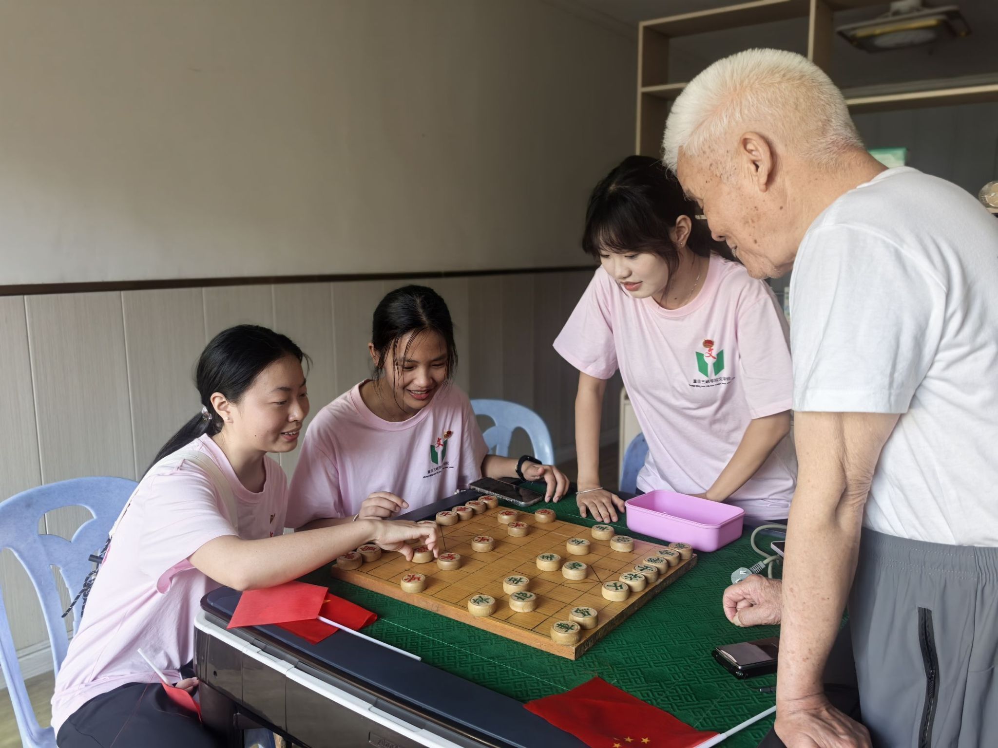 志愿者与老人们围坐在一起,共同唱响经典老歌。悠扬的歌声在敬老院里回荡,《我爱你中国》《强国战歌》《五星红旗迎风飘扬》等一首首熟悉的旋律,他们跟着节奏轻轻哼唱,脸上洋溢着幸福的笑容。志愿者与老人们自由结对,与老人一起写毛笔字、画画、下象棋、共同完成粘土作品,老人们喜笑颜开,纷纷“炫耀”自己的作品。实践团成员陈沛洁认为,和爷爷奶奶们相处的时光很美好,他们的故事让我深受触动,希望以后能有更多机会看望他们。