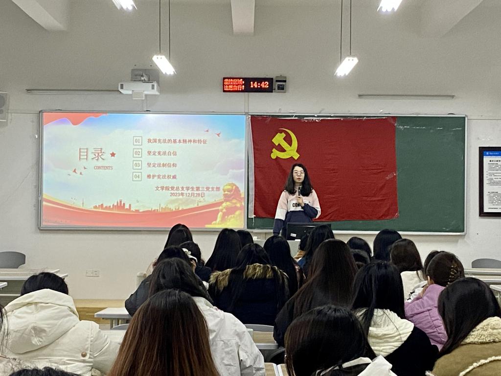 为进一步彰显中国特色社会主义的道路自信、理论自信、制度自信和文化自信,增强全社会的宪法意识,2023年12月28日,公司党总支员工第一、第二和第三党支部在博学楼2栋104室开展本月主题党日活动,支部书记、正式党员和预备党员参加。